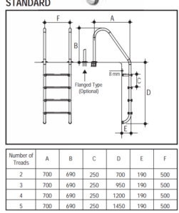 Largeur 500 mm. Marches antidérapantes en acier inoxydable AISI 304. Sorties de bain en acier inoxydable de qualité AISI 304 poli Ø 42 mm. Complet avec ancrages plastiques, enjoliveurs, capuchons, boulons et écrous.